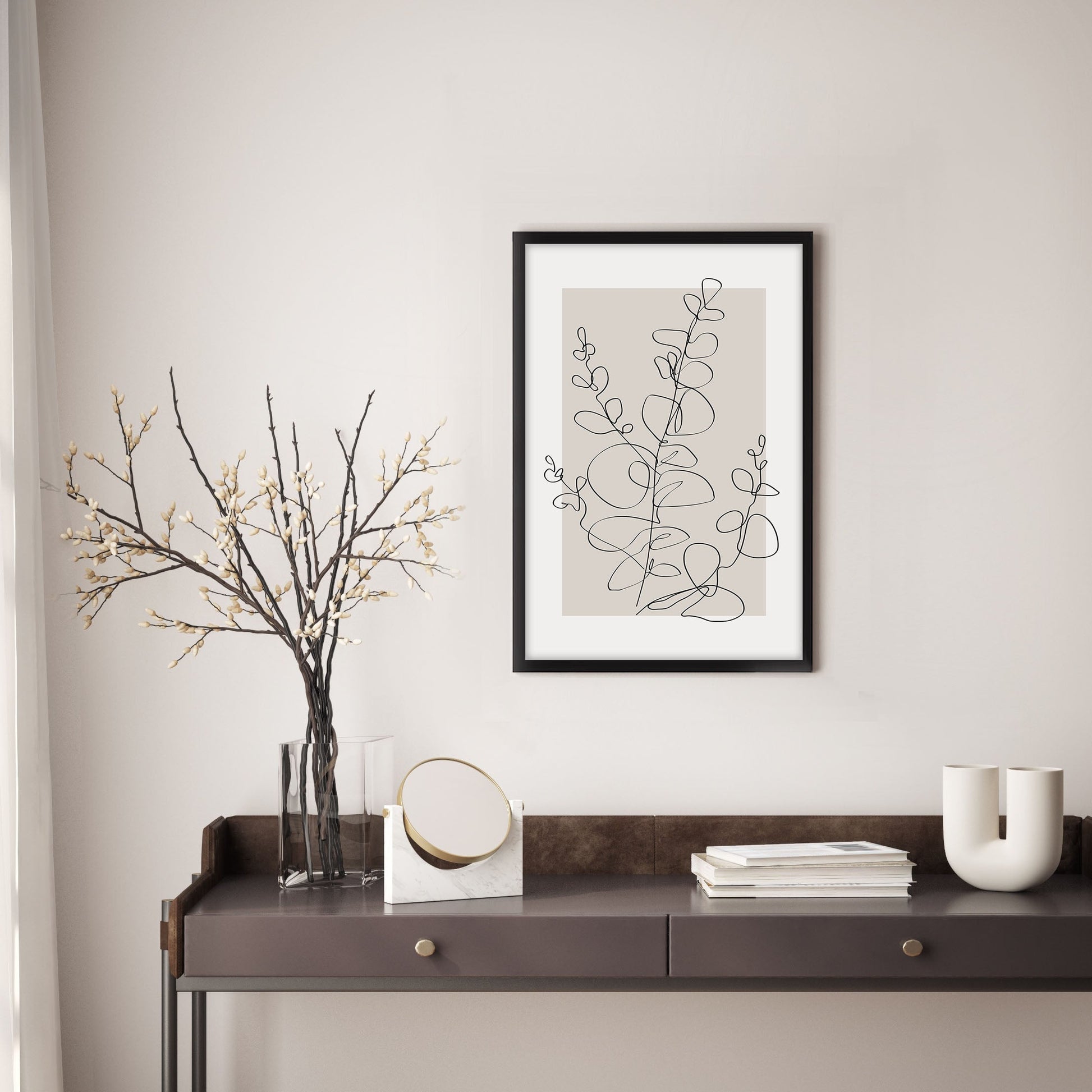 Add a touch of elegance to your home with this stunning Ethan Taylor™ ‘Eucalyptus Line Art Beige Neutral' framed art print! This beige and black botanical piece featuring botanicals is printed on premium, museum quality premium art paper in your choice of black or white wooden frames or unframed prints. The prints arrive secured within the frame, and ready to hang so that you can enjoy your new artwork in no time. With a variety of sizes available, you can find the perfect fit for any space.
